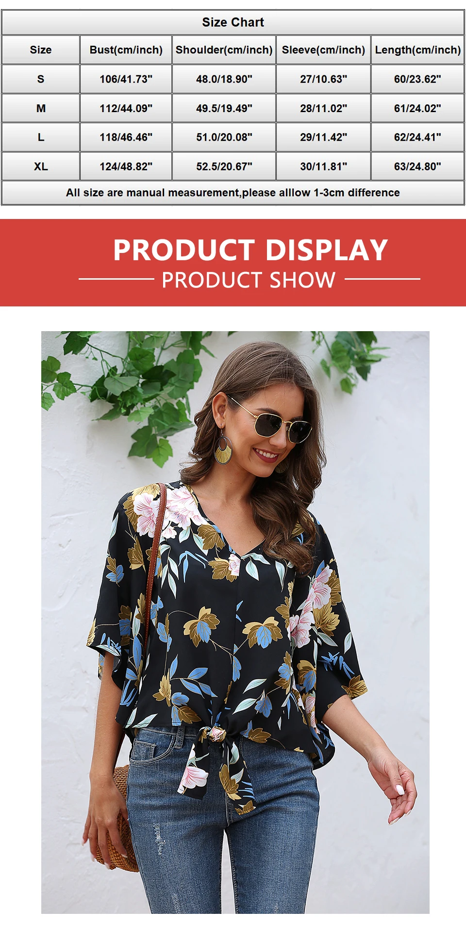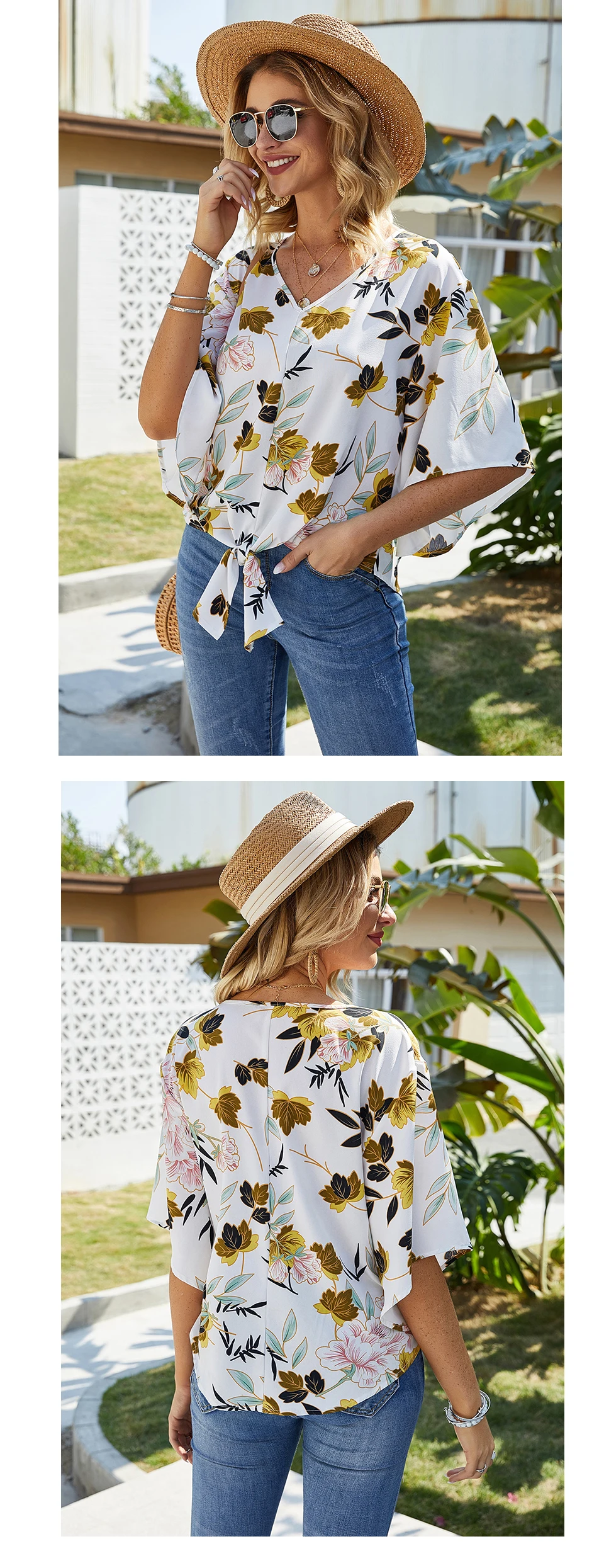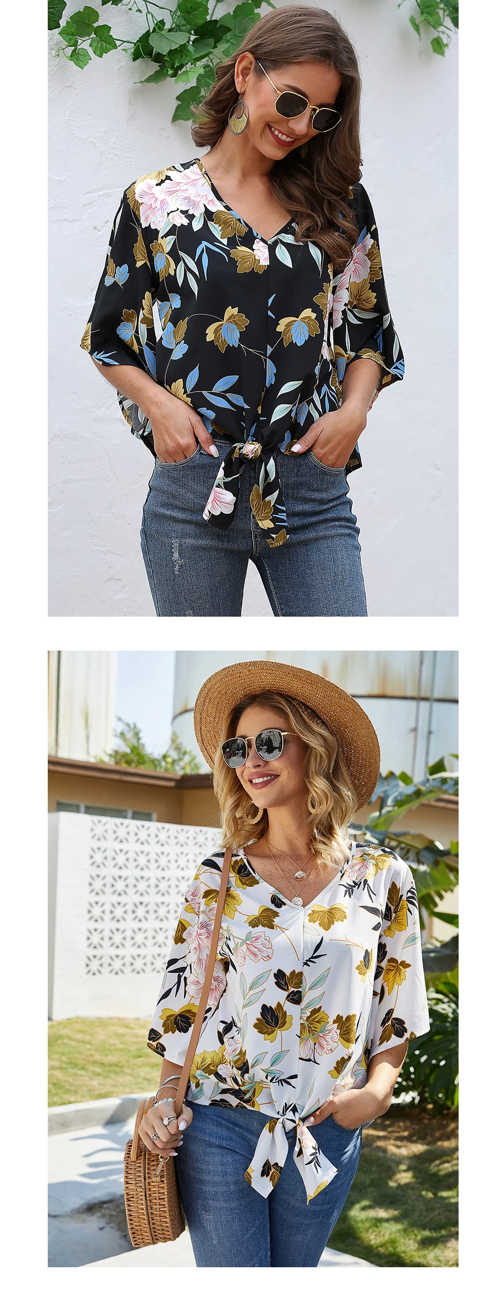 CINESSD Print Chiffon Blouse Women V Neck Flare Sleeves Floral Loose Casual Boho Shirts Knotted 2020 Office Ladies Tops Blouses