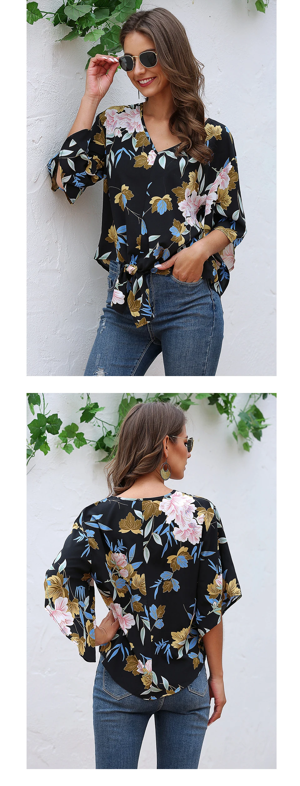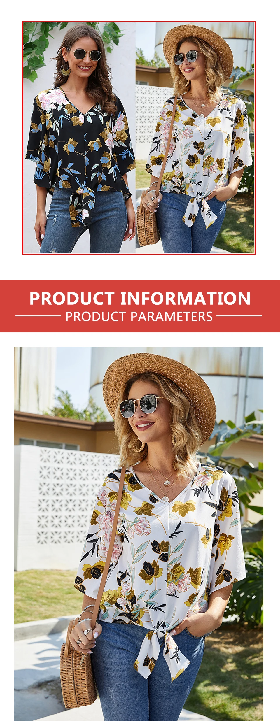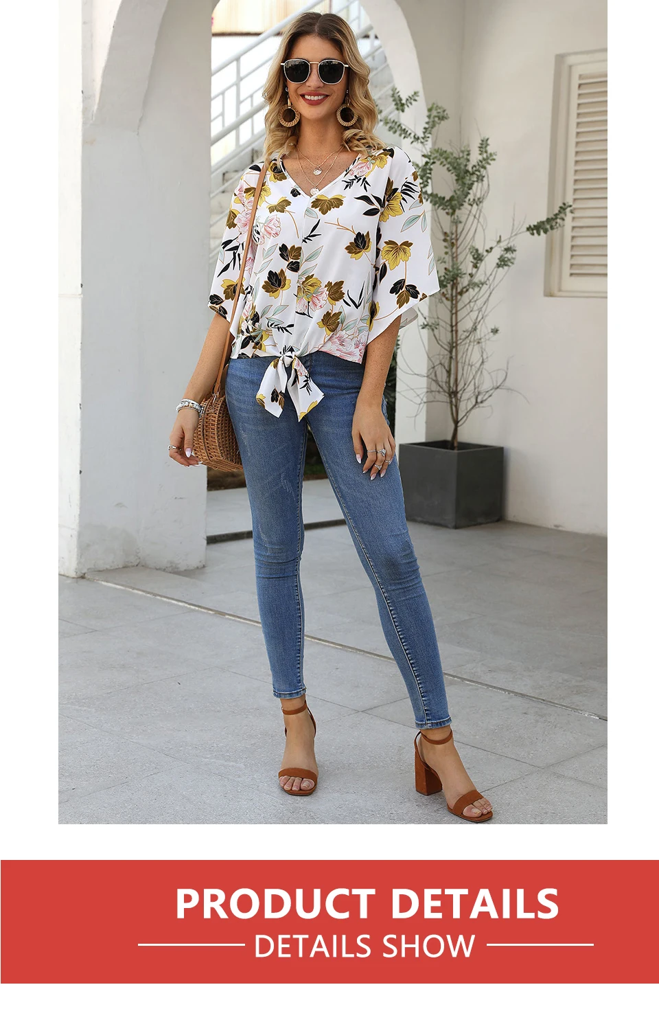 CINESSD Print Chiffon Blouse Women V Neck Flare Sleeves Floral Loose Casual Boho Shirts Knotted 2020 Office Ladies Tops Blouses