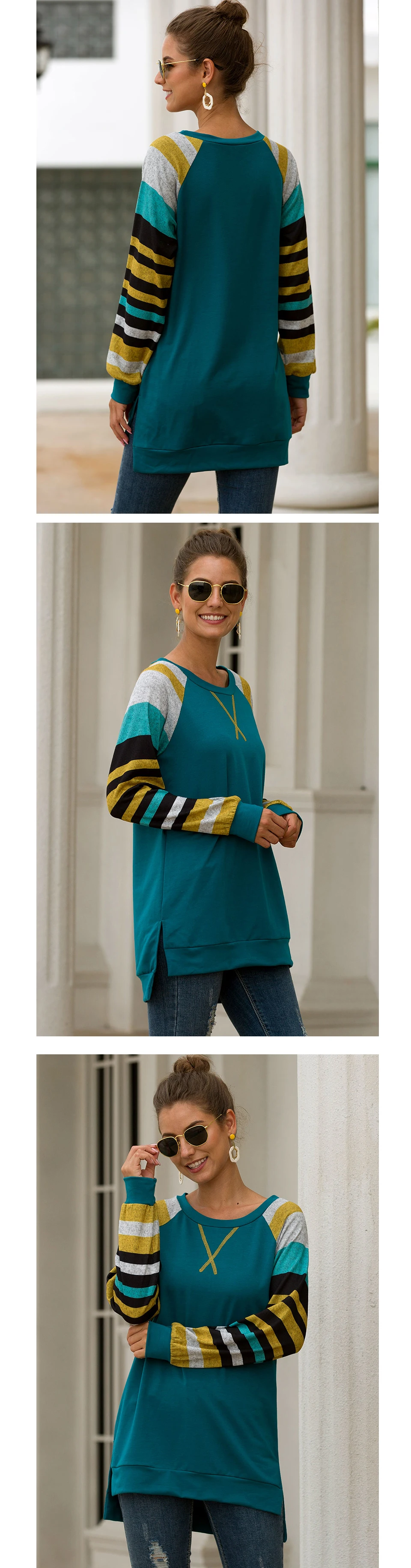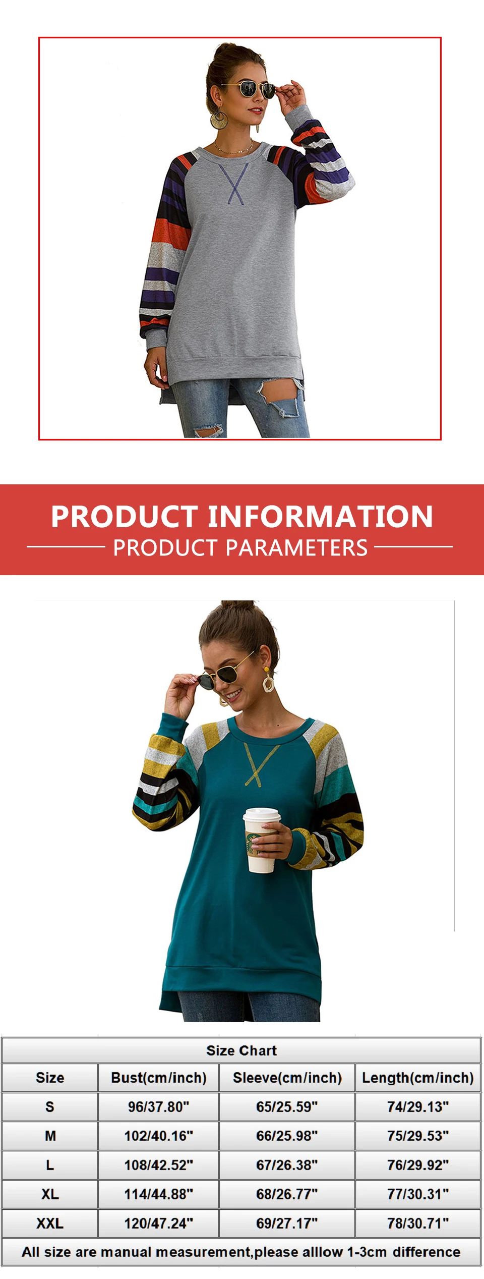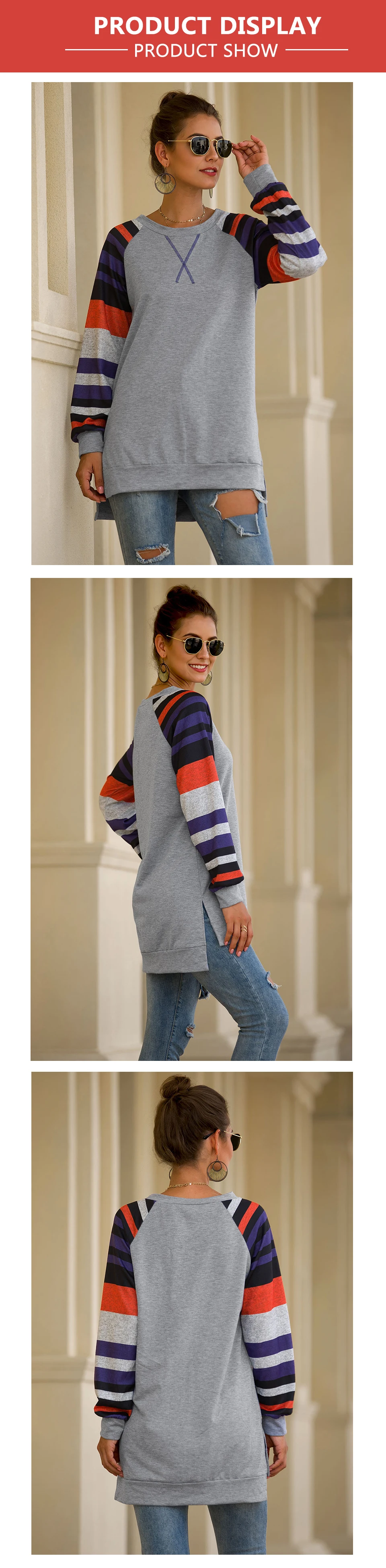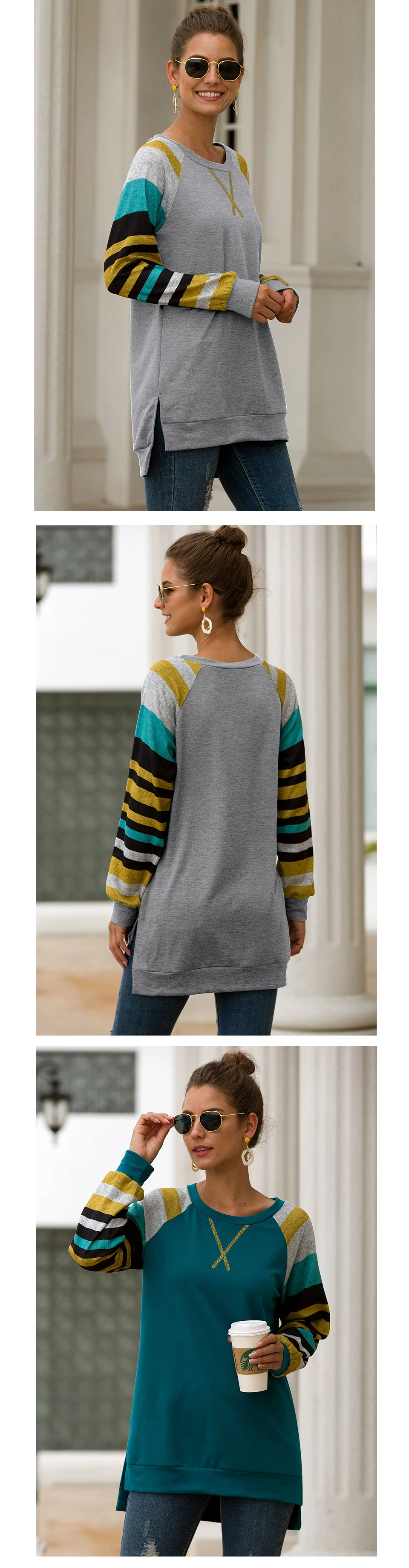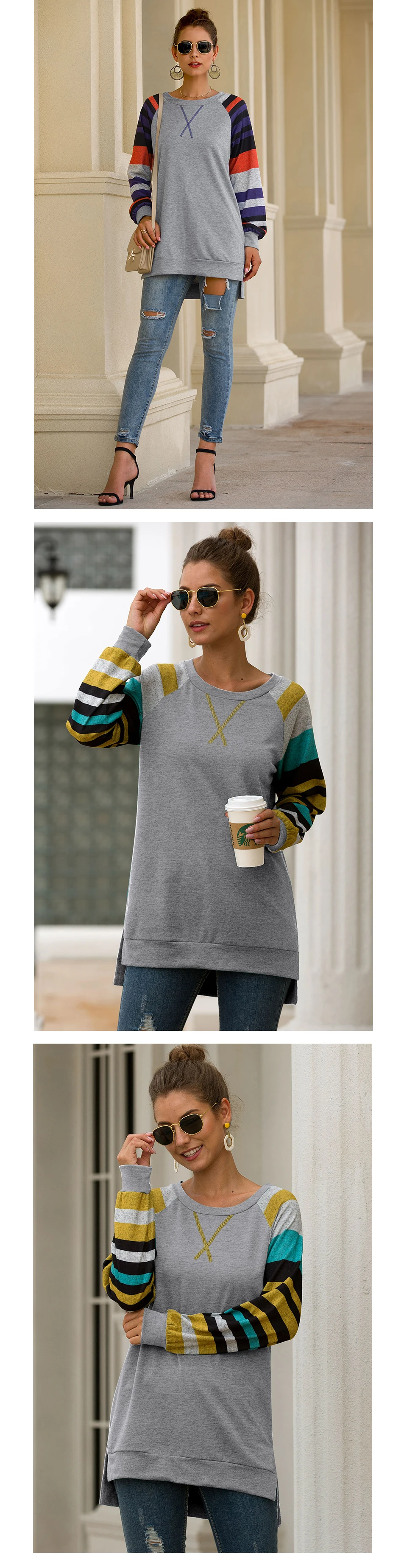 CINESSD Striped Patchwork Casual Tops Tee Shirt Women O Neck Long Sleeve Embroidery Split Loose Pullover Asymmetry Tunic Tshirt