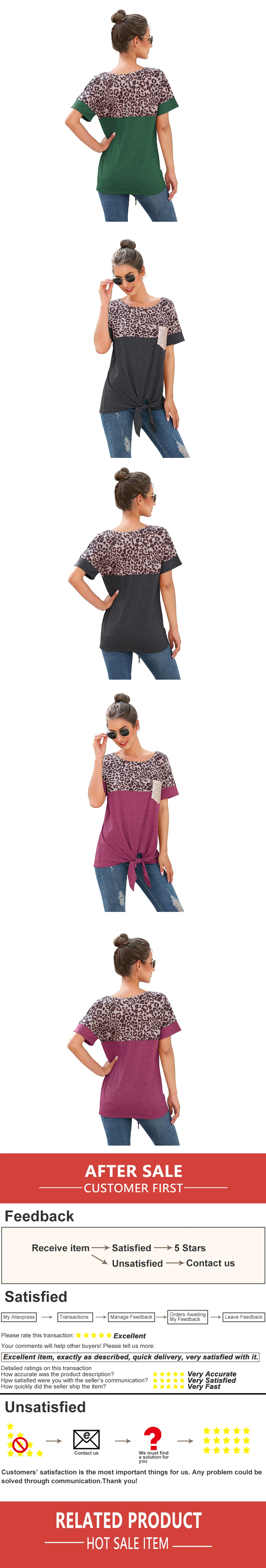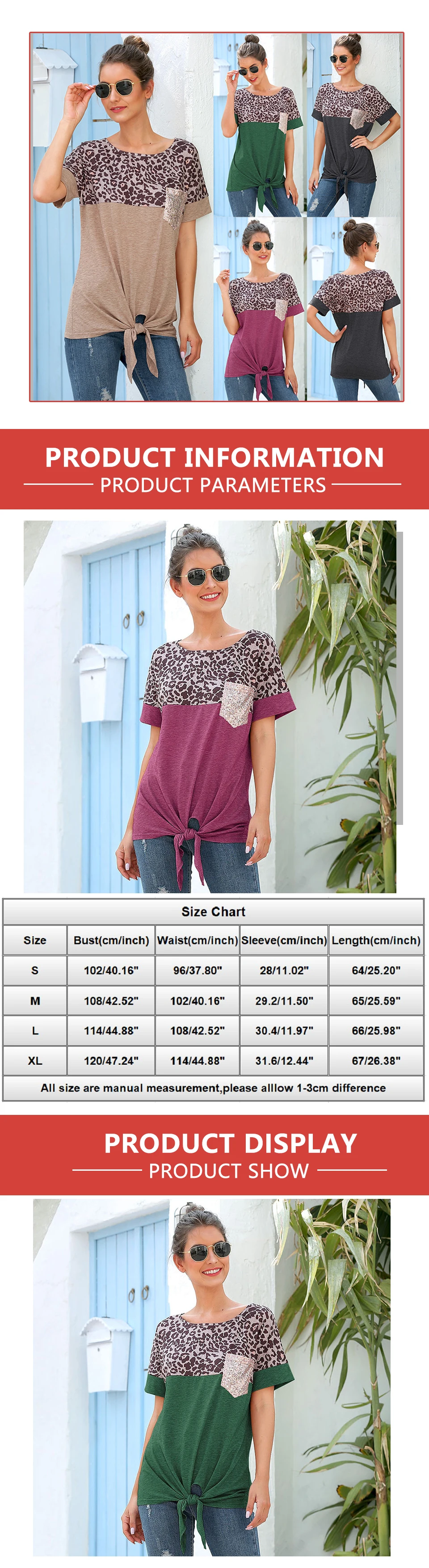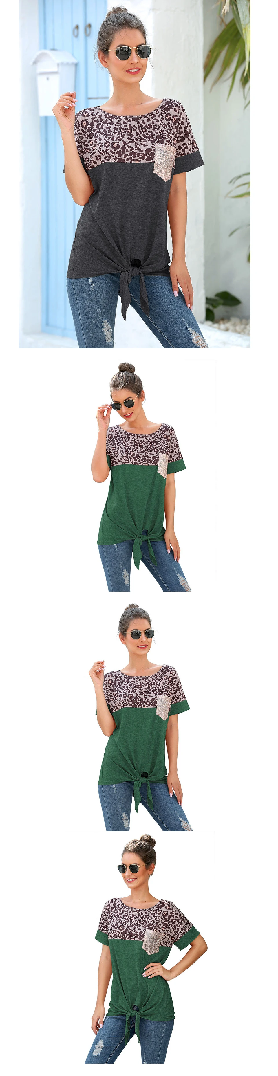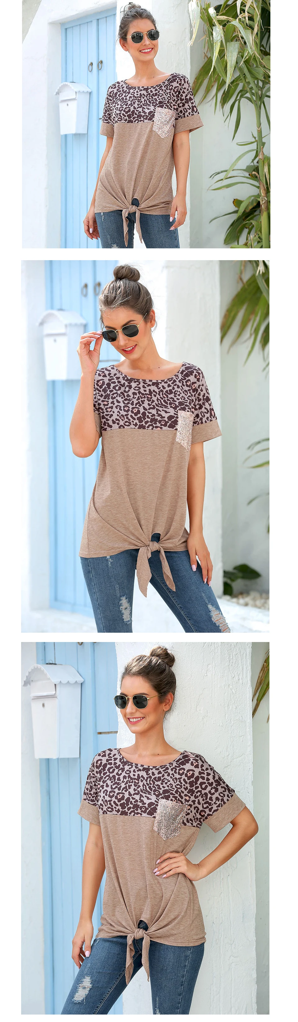 CINESSD Women Short Sleeves Tee Shirts Round Neck Leopard Patchwork Pocket Sequin Tops 2020 Knotted Spring Summer Loose Tshirt
