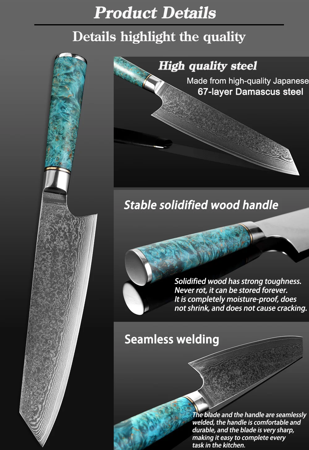 SUPER SHARP EDGE - 67-layer Japanese Damascus super steel with a finely polished surface. Corrosion resistant and tough. The curved edges are sharp, more durable and sharper. It can be stabilized at 60 ± 2 HRC, with vacuum heat treatment hardness and long-lasting clarity.