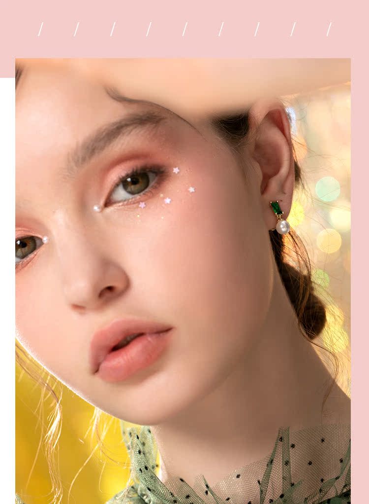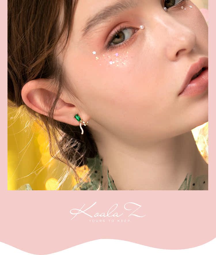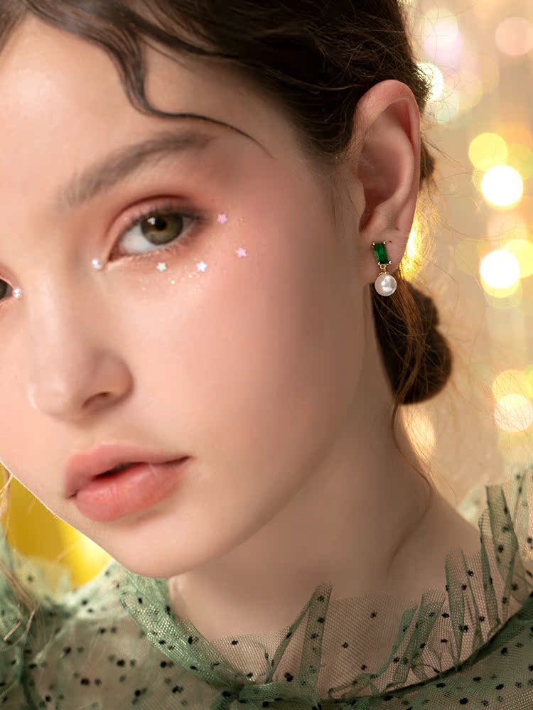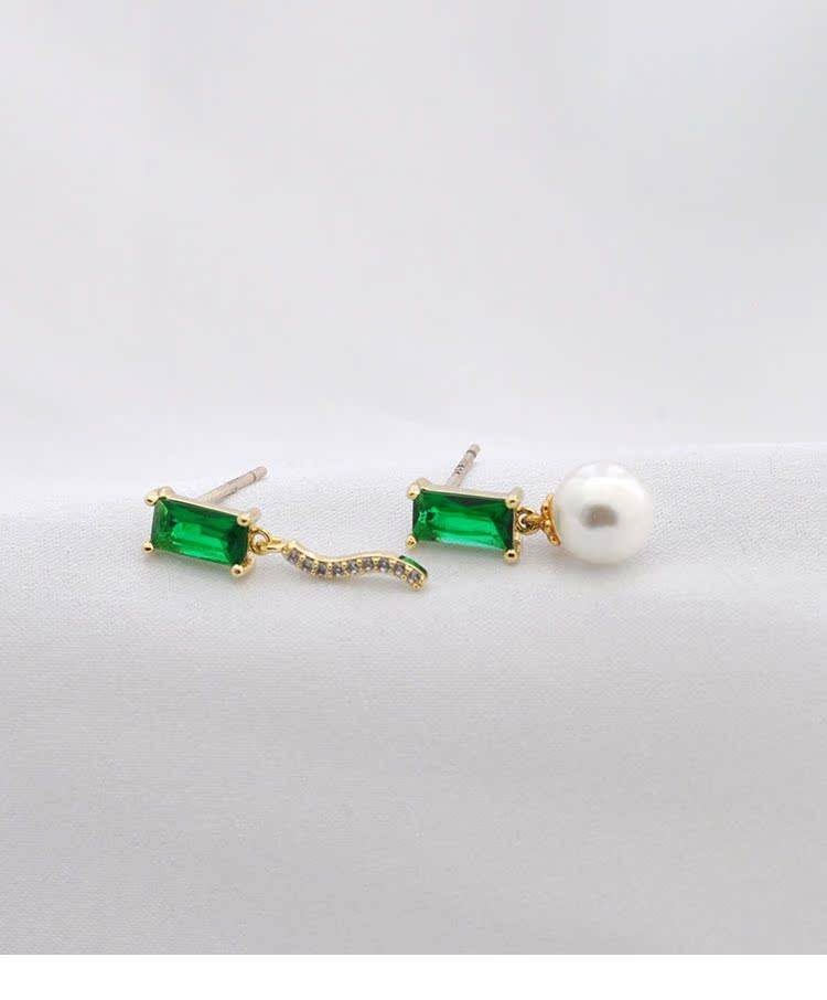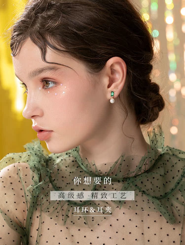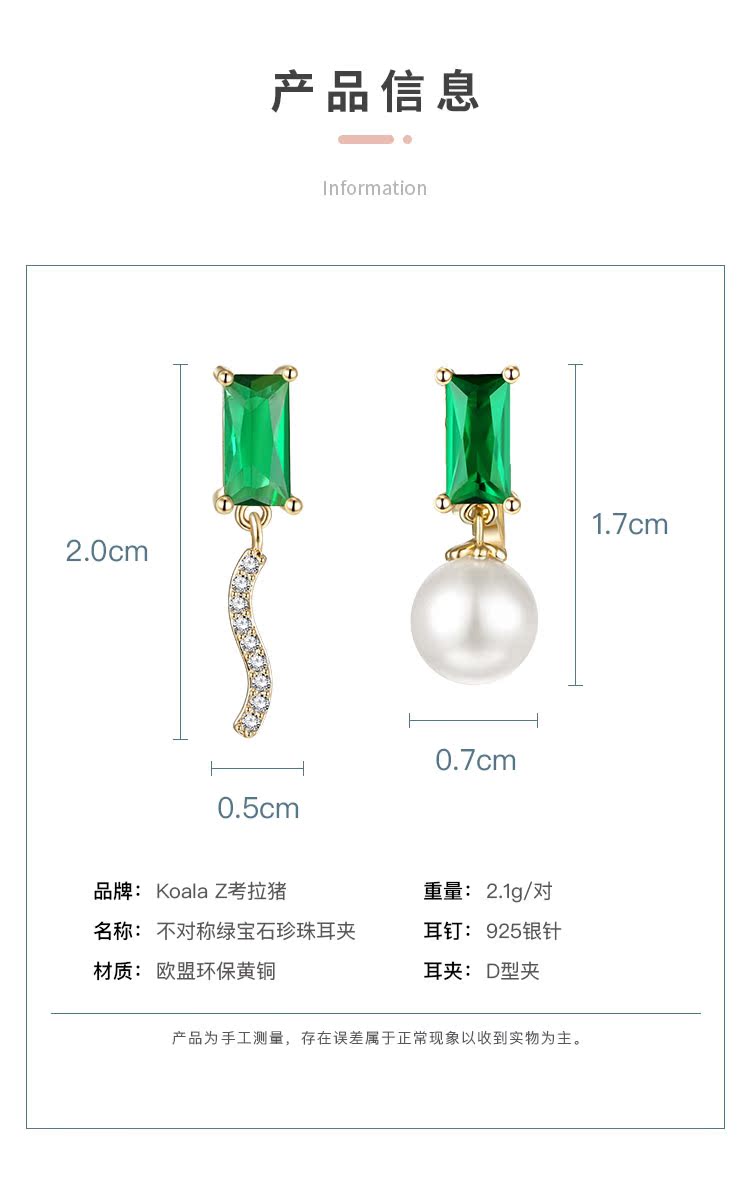 精致小巧的祖母绿 精致锆石不对称绿宝石小珍珠耳环耳夹无耳洞女